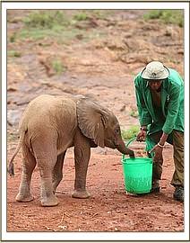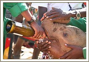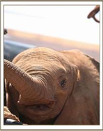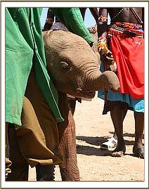 As the men with the calf waited for a miracle, suddenly at 1.30 p.m. a huge wall of water came flooding down the Milgis lugga, which would definitely have drowned the little elephant had the passerby not found her in time. If ever there was a lucky little orphan, it has to be this one. The men remained with the baby all that day and throughout a very uncomfortable night, surrounded by hungry hyaenas who had an eye on a free meal, fearful that they might be taken unawares by a visiting herd of elephants, or perhaps the return of the mother. One old bull appeared during the night, splashing his way across the shallows in the lugga, which had not yet received the flood. The men prepared themselves to have to beat a hasty retreat, should he turn aggressive, but he merely looked at the calf, who was bellowing loudly and was desperate to join him, before moving on.