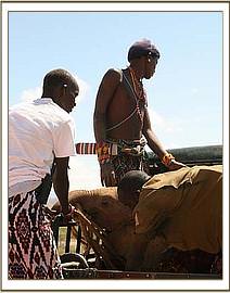 The passer-by managed to get a message to the Milgis Trust Headquarters and a 5 man rescue team was soon at the scene. They managed to manoeuvre a rope loop around the torso of the calf, the baby making this easier by standing on her back legs in a desperate attempt to get out. Having been hauled out, she was strong enough to give her rescuers a run-around, for she immediately began chasing them. The team did their best to calm her down and eventually managed to restrain her and tie her legs, as others went in search of any nearby herds that might include the mother. The Milgis Trust also positioned people on all available high ground to try and search for elephant herds, or any lone cow that might be the calf’s mother, hoping to be able to reunite her with her elephant mother.