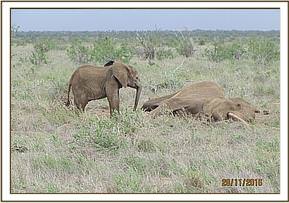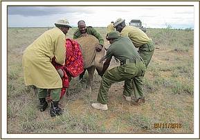 Although some rain had fallen recently, it had come too late for the mother, who had obviously been struggling for a long time evidenced by the bare earth that surrounded while her desperate baby helplessly stood by her side. This sighting was immediately reported to the SWT/KWS funded Mobile Veterinary Unit headed by Dr. Poghon, and together with Keepers from our Voi stockades, the rescue teams proceeded to the scene, having been given coordinates by the Tsavo Trust Pilot.