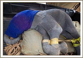 The elephant was carried into the taming stockades and helped to his feet. Despite his gruelling ordeal he looked strong but had many bruises on his head and face caused by his attempts to free himself from the well and his elephant family’s efforts to extract him. The calf was aggressive at first to his Keepers until he calmed down whilst taking his milk, falling into a deep sleep an hour later, simply exhausted from his ordeal.