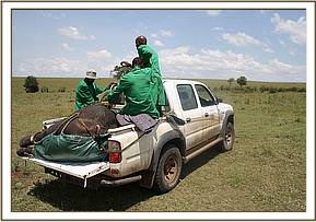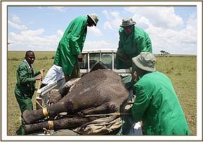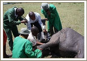 The David Sheldrick Mara mobile veterinary unit had actually just returned to Nairobi in order to fix their vehicle that had been smashed while treating a black rhino case in Nakuru National Park. During that time the team had planned to take a much needed four days off. Having received this report the unit was immediately contacted and agreed to forego their off time in order to set off using a spare Sheldrick Wildlife Trust vehicle for the long drive back to the Masai Mara. They arrived well after dark and only managed to catch up with the calf at dawn the following day. This calf had been observed for 3 days alone on the vast grassy plains without any other elephant herds in sight. KWS vet Dr. Domnic Mijele seconded to the SWT Mobile Mara Veterinary Unit confirmed that this calf did indeed require rescuing if he was to survive, as he was estimated to be two years old and still milk dependent. His wounds, while not life threatening, were causing him a great deal of discomfort.