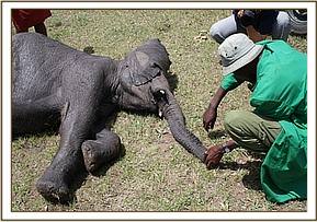 Now safely of this stockade at the Nursery it was almost immediately that he took to his milk bottle, but a number of days before he tamed down enough to be handled without caution. The Keepers were treating his painful wounds which made him weary of them.