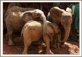 As usual, at first little Lenana was quite “wild” and aggressive towards the Keepers, but within just a few hours she could not resist hungrily downing her first milk feed offered her by a Keeper, before trying to pin him against the wall! The other eight Nursery elephants were brought in to meet, and comfort her, and that night she slept in what is known as “The Taming Stockade” next door to that occupied by Kora, the biggest boy in the Nursery, who, along with Lualeni (the biggest girl) will soon be traveling to Ithumba to begin his gradual graduation back into the wild system. That night Lenana was exhausted, and slept well, again hungrily downing her three hourly milk ration. She was so anxious to join the others that we allowed her out the following morning, but she was still too afraid of the Keepers to accept her milk out in the bush, and since elephants lose condition frighteningly rapidly, the next day we decided to keep her in the Stockade with two Keepers to work on her and secure her confidence. (Indeed, just that one day without milk had resulted in the skeletal pronounced cheekbones indicative of milk deprivation). After two days in the Stockade with the Keepers, Lenana was out and about happily embraced by the others.