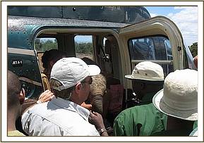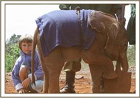 She is only about 4 weeks old, and she arrived in a Helicopter that landed, literally, at our doorstep, kindly loaned by Mr. Halvor Astrup, the owner of Enoiset Ranch near Nanyuki. The little elephant had been without her mother for some 36 hours before being rescued and had been held at a remote Samburu manyatta far removed from any road or airfield, so nothing but a Helicopter could activate this rescue. Too young to know fear she was loaded in the back of the Helicopter with Helen by her side for the flight from the North to Nairobi. On arrival she trustingly walked from the Helicopter with the Keepers to her waiting stable, where she was fed her first bottle of milk and given the first precautionary antibiotic injection to guard against pneumonia and other stress related conditions that depress an animal’s natural immune system. We are deeply grateful to Mr. Astrup for so kindly collecting this baby from such a remote destination, and furthermore for going the extra mile and bringing her to us in his Helicopter, which saved us a great deal of trouble, particularly on a Sunday! We are also very grateful to Helen Douglas-Dufresne for coordinating the calf’s rescue, and to the Helicopter Pilot, Phil Mathews who once headed the KWS Airwing, so is well known to us.