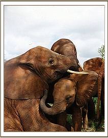 Lissa immediately bonded with Eleanor, and was with her until Eleanor became pregnant in the early nineties, handed over her adopted family to a wild friend, the cow given the name “Catherine”, and left to have her baby far from the possibility of human intervention, obviously fearful that her human family might take it from her. (Female elephants who do not have an intact blood family of their own, are very prone to trying to abduct young calves in order to build one, and Eleanor herself had been guilty of this with the first-born of another elephant named “Mary”, who was within her unit. Since Eleanor was not raised through the Nairobi Nursery, unlike others that were, she did not understand how Daphne came to have so many elephant babies, and thinking in elephant terms, feared that they, too, must have been abducted!)