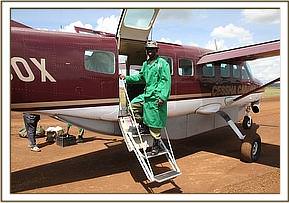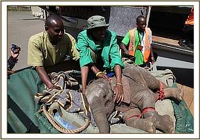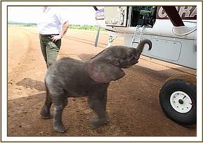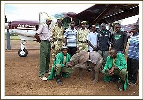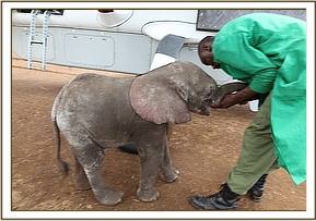 The following morning (25th June 2012) the Area Warden called us at The David Sheldrick Trust’s Elephant Nursery. A rescue plane was sourced and chartered from East African Air Charters at Wilson Airport, and equipped with all the necessary paraphernalia, two Keepers were soon airborne, bound for the Simba Farm bush airstrip where they landed at 11.45 a.m. Meanwhile, the little elephant was being escorted to the airstrip, accompanied by hordes of interested spectators, turning up at 12.20 p.m. He was fed formula milk and electrolytes by the Rescue Team and before being loaded into the plane, the Keepers addressed the assembled onlookers thanking them for not harming the little elephant, who was extremely trusting and too young to know fear. He had been orphaned as a result of what is known as Problem Animal Control, his elephant family having been driven out of what is now human settlement but which in earlier times had obviously been part of their natural range.