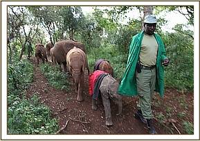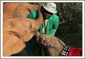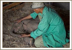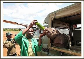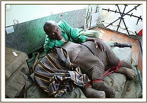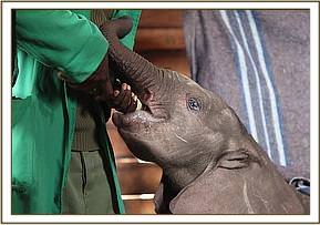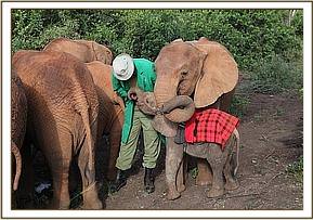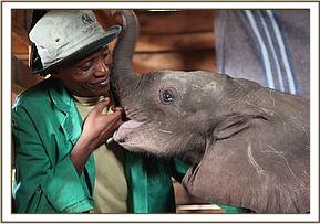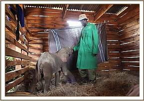 Hearing the boy’s screams villagers rushed to the rescue, so the little elephant attached itself to them instead, relieved to have company, since newborn elephants are usually part of a very adoring family and under normal conditions are never left unattended. The villagers sought the advice of the Area Councillor, who in turn alerted the local Chief. He then got in touch with a Kenya Wildlife Service patrol who happened to be in the Lorian area at the time, but by now it was 6 p.m., too late for a rescue that day. The Rangers held the baby overnight in their Staff Quarters, feeding him only water to keep him hydrated, aware that baby elephants are totally intolerant of cows’ milk.