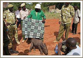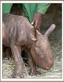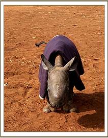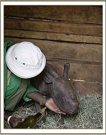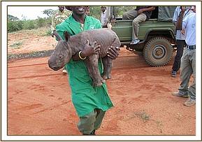 He was literally only a day or two old when he was found by a Ranger of the same name during a routine patrol of the Sanctuary on the 18th of December - a tiny bundle that looked more like a baby warthog than a rhino with no sign of a mother anywhere near. He was left for a day to see if his mother would retrn, but by evening the calf was very weak, so Ranger Maalim carried him back to the Ranger Base and alerted the Senior Warden Tsavo East who in turn got a message to us that a rhino calf was in urgent need of the Trust’s help and input. It was requested that we take over the little rhino, to save his life and also requested that he be named “Maalim” in honour of the Ranger responsible for rescuing him.
