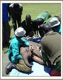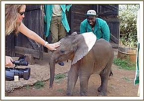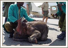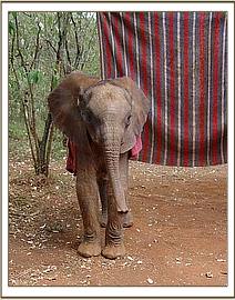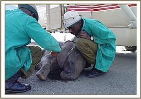 After taking some rehydration her front legs and back legs were carefully tied and she was loaded into the small plane and flown directly to Wilson Airport in Nairobi. The moment she stepped onto the airfield apron she lay down and rolled around on the loose gravel, enchanting all those that looked on with absolute amazement and she seemed oblivious to the busy airport around her. Later she followed Benson past the aeroplanes, the fuel bowsers and the gawking onlookers to the aircraft hanger where a land rover waited to transport her the short distance between Wilson Airport to the Trust’s Nursery in Nairobi National Park. No one could believe this tiny fuzzy bundle of mischief, who soon took over the Nursery compound. After a drink of water and a splash and spill from the bucket she flopped down wiggling away in the small muddy patch which had formed as a result of the spilt water. One by one all the Keepers came to view this cheeky little newcomer who was happy to follow everyone and anyone.
