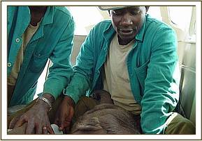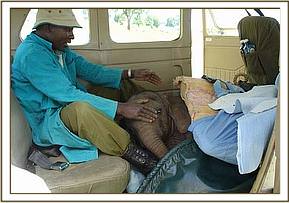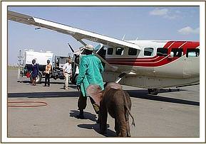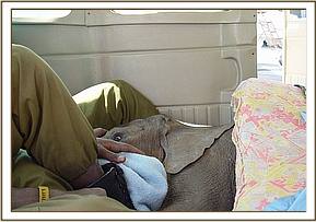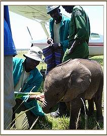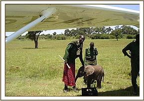 On closer inspection they discovered a tiny calf, confused, alone and abandoned with no elephants to be seen any where in the area. The baby, desperate for company, followed them back to their camp, and from there the rangers contacted Sean Outram who works on the ranch and told him about their tiny little orphan. Sean drove to the camp and collected the calf, and loaded her in the back of his vehicle, contacted the Trust in Nairobi, and headed to the closest airstrip to wait for the rescue aircraft.