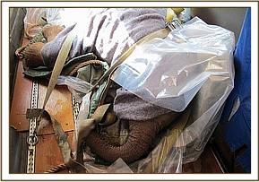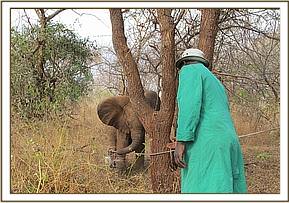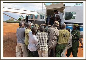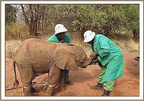 As usual, the Trust chartered a Caravan Aircraft, which left Nairobi at around 2 p.m. to airlift the orphan back to the Nairobi Nursery, where she arrived soon after 5 p.m. and was put in the stable next door to that of Kudup. Being still relatively strong but understandably extremely fearful and aggressive, it took three stalwart Keepers to ward off her repeated onslaughts and to set about calming her overnight and getting her to take milk. By morning, they had succeeded, and the calf had taken milk overnight and was desperate for more, but in this respect it is important to proceed cautiously and not to overload the stomach of an emaciated candidate for fear of upsetting it. Such calves are usually too feeble to withstand diarrheoa which, in an elephant, is an extremely life threatening condition.