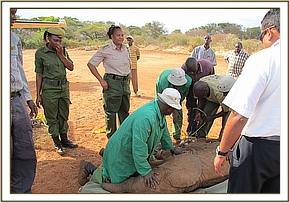Mercifully this young calf escaped that fate, her presence instead reported to the officer in charge of the Taveta Out Station, Ms. Constance Mwasho who, in conjunction with the Senior Warden in charge of Tsavo West, Daniel Woodley, alerted the Trust and coordinated the rescue.