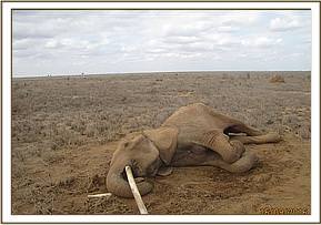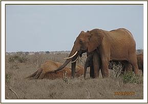 A driver from Tsavo Trust first reported the situation to the SWT/KWS Tsavo Mobile Veterinary Unit’s Dr. Poghon, when they found the mother recumbent on the windswept Dika plains, withered and gaunt and in extremely poor body condition, but with no evidence of any wounds or injuries. Her family stood vigil as the SWT’s Rescue Team together with KWS rangers lifted her to her feet multiple times. Sadly, she was unable to stand and just crumpled to the ground each time. It was clear her life force was ebbing away and it would be necessary to rescue her young milk-dependent calf, approximately six months old, who already was undernourished, presumably as a result of her mother’s compromised condition and lack of milk.