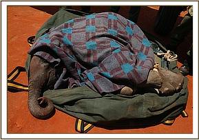 This old queen of the plains was humanely euthanized to save her the indignation and suffering of being torn apart by predators, whilst her baby was rescued as night approached and was then driven to the Voi stockades where she was placed in one of our taming stockades. She had greens carefully cut for her which she fed on throughout the night, and Keeper Julius slept in the stockade bunk-bed close to her, to keep her company. The presence of an interested army of dependent Voi elephants surrounding her stockade helped settle her as they rumbled in low tones, comforting and reassuring her. She even slept for a while having endured quite the ordeal; how long her mother had been in a collapsed state before being discovered is unknown.