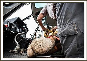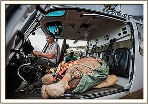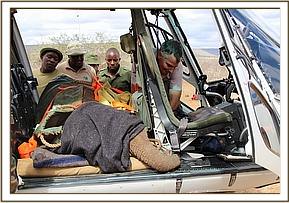 He was now prepared for transport, all during the most brutal time of day at 3.00pm with temperatures soaring, reaching some 38 degrees in the shade. By now Andy in the SWT helicopter had arrived at the strip, and having removed the back seats already was prepared so the calf was carefully lifted and maneuvered into the aircraft and made comfortable with his legs safely strapped, all the while the IV fluids were still dripping into him. Without delay he was up and away and headed for our Nairobi Nursery as he was going to need serious intensive care for weeks and months to come back from the brink. Fittingly we named this young calf, estimated to be approximately a year old, Mapia, after the location where he was miraculously found in time.