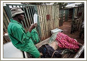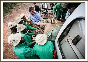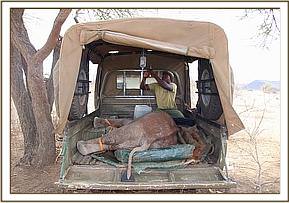 By the time the team arrived on site, a one hour drive from Voi, HQ for the southern section of Tsavo East, the situation looked bleak. Despite the elephant herd lingering on the banks of the river we were forced to move the recumbent calf into the Landcruiser and make a hasty retreat to Lugards airfield on the south bank of the Galana River, just a short 5km drive away. Once there they lifted the baby out of the Landcruiser and lay him in the shade of an acacia tortilis tree, and immediately set about trying to revive him, placing an IV drip into the calf’s by now sunken veins so low was his blood pressure. To everyone’s relief after a while he stirred and they dared hope that just maybe they were in time to save his precious life. As they stabilized him, ensuring he received a healthy amount of fluids into his system, his eyes opened and he became increasingly responsive.