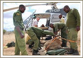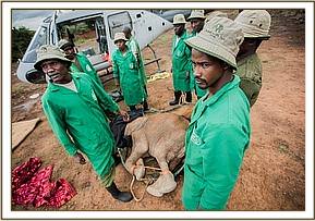 The Rangers were not actually sure he was still alive, and certainly didn’t fancy his chances of lasting until ground teams from Voi reached him. Thankfully they were swift to report his plight over the radio alerting our Voi elephant Keepers and the SWT team accompanied by additional KWS Rangers rushed to the site. Due to the drought our teams have become well versed in the life saving protocols required to retrieve desperate drought-stricken victims who simply can no longer continue, so they carried with them all the necessary supplies and equipment required. At the same time the SWT helicopter pilot Andy Payne was informed too so he prepared everything from his end, based out of our Kaluku Field headquarters. With ground teams and air rescue well coordinated unnecessary delays were avoided as with this case it was clear every minute was going to count.