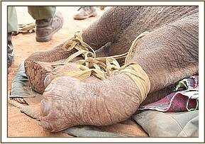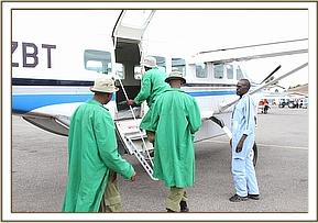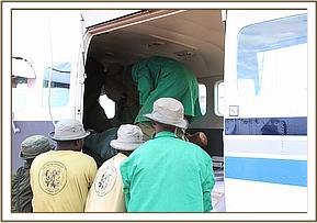 The Nairobi SWT team, having waited for confirmation that the calf had been located by the Voi team, departed Wilson airport at about 3.30pm. The Voi team had driven to Aruba airstrip and secured the elephant ready to be brought back to Nairobi. The Nairobi Team arrived at the Aruba airfield at about 4.45pm where the race was on to get the baby onto the plane and back to Wilson before dark. She was quickly loaded, given Stresnil to calm her and put on a saline drip for rehydration.