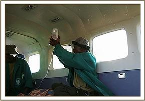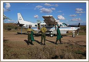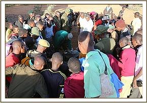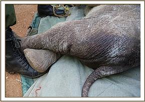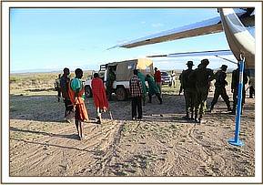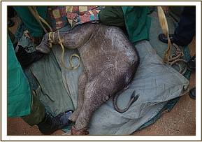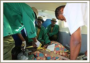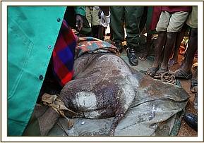 The angry community of Kimanjo had set upon the baby in revenge spearing her several times. When she took refuge in the grounds of a nearby school the children began stoning her. Very swiftly the warden of the Naibunga Conservancy came to the calf’s rescue and kept her safe from the community who were baying for her blood in retaliation for recent events. While in close communications with KWS who were trying to instill calm to a difficult situation, the SWT rescue team were sent from Nairobi departing at 3.00pm from Wilson airport. After a one hour flight they arrived on the Ol Lentille airstrip and were immediately collected by a KWS land cruiser and taken to a nearby village where the calf was.