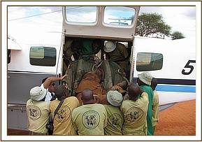 With the help of KWS Rangers, our Voi Elephant Keepers were able to overpower the abandoned calf, and having covered its head with a blanket and bound its legs, transported it back to the Voi Stockades for the night where it took water, and a little milk from a bucket. The next morning it was airlifted to the Nairobi Nursery., initially named “Sombe” after the KWS Security Commander, but later renamed Melia after the African Mohogany Trees (Melia Volkensi) which are a feature of the area, and were planted by the late David Sheldrick around the Headquarters and at the 5 Entrance Gates to Tsavo East National Park.