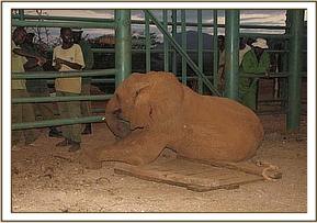 Orphans two and under cannot live without their mothers milk, and calves orphaned three years old and under seldom survive unless the conditions are incredibly favorable. This young female's chances of survival seemed slim with Tsavo presently in the height of the dry season, and at the mercy of the Tsavo lions without the protection of older elephants by her side. Julius bravely led the charge towards the calf but very quickly she overpowered him and had him pinned on the ground but fortunately, while bruised badly, he suffered no serious injuries, but the whole incident detracted from the rescue at hand and the calf fled into the dense undergrowth of the Voi River, and the Keepers scattered in all direction. Shortly thereafter the Mobile Veterinary unit arrived and continued to monitor the calf's movements while Julius was whisked off to a nearby hospital to be sure he had not suffered any further injuries aside from the obvious bruising.