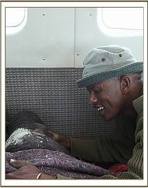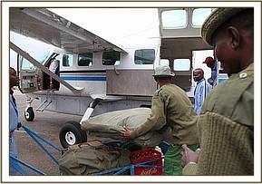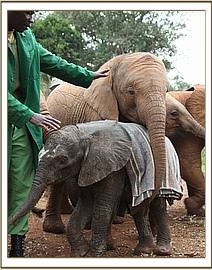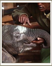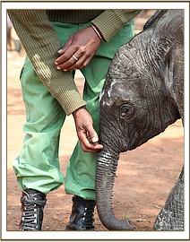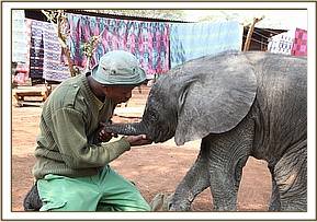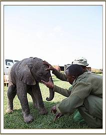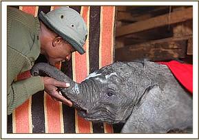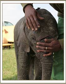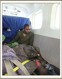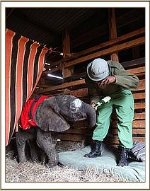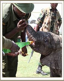 The orphan was a baby bull, estimated to be about 2 months old, since the first molars were beginning to erupt, and the pads of the feet worn. Apart from a deep machete cut on his head, believed to have been inflicted by either un-ele-friendly farmers or pastoralists grazing livestock in the forest, the baby was in fair physical condition. He is almost certainly a victim of poaching, which has escalated sharply in the area of late. (26 elephants are known to have been poached in the Mt. Kenya forests since January 2011.) His Saviours were KWS personnel, Cpl. Kilonzo, Rangers John Ombongi, Siyati Farah and Theophillas Muthui and Scout Charles Nyagah. Robert O’Brien supervised the holding of the baby in his home until the plane arrived the next morning, it being too late to mobilize an air rescue by the time the message was received in Nairobi. Well versed in the needs of infant elephants, the calf was fed only water prior to a formula feed as soon as the plane landed.