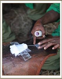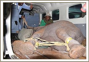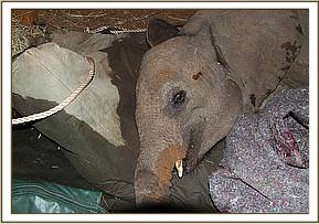 Piers alerted us about the orphan, sending along photographs so we could assess her size and age. He then drove to KWS Headquarters to get permission to rescue her. Meanwhile, we flew a team of Keepers up to Meru. Upon landing, everyone gathered at the orphan’s location. By late afternoon, the calf was en route to the Nursery. Everyone was taken aback by her condition: She had trodden on an elephant spike trap, which ravaged her hind leg and left her with deep, poisoned wounds. While struggling in vain to keep up with her herd, she must have fallen and dislocated her leg joints, because her entire hind area was debilitated. Her little forehead was etched in pain, a heartbreaking reminder of the trauma unfolding within. The memories of what humans had inflicted upon her was still fresh in her mind, and despite being severely incapacitated, she was very wild and rebuffed all help.