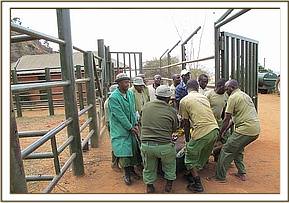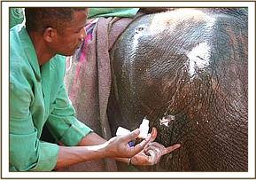 Murka has a strong will to live, and also a strong desire for revenge for what she has suffered at the hands of humans. In order to clean her wounds, she has to be sedated with Stressnil before anyone can attend to them, since physically overpowering her with sufficient manpower causes more stress which could prove counter-productive. The body wounds, although deep and horrendous, are superficial and will heal with time, but the head wound is more serious and we can only pray that it will not interfere with her breathing, or the use of her trunk, for life. After l0 days in the Stockade, we tried to allow her out with the other orphans, hoping that she might take her cue from them, but instead she was bent on escape. So, not without a great deal of difficulty, she was eventually overpowered and returned to the Taming Stockade.