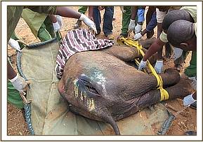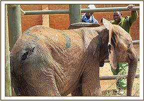 Several attempts to encircle and overpower the calf proved fruitless, for being nearer two years of age than one, it was very strong and, understandably, extremely aggressive, charging anyone on sight through the thick bush. Eventually, having had to scale a tree in order to escape being crushed, the Vet managed to dart the calf, loaded with immobilizing drug, and once she was down was able to assess the extent of the injuries. The spear had penetrated some 20 cms. through the skull and into the nasal passage sinuses at the top of the trunk. It was with great difficulty, using wire cutters and great deal of strength that Dr. Poghon managed to extract it, leaving a deep hole in the head through which air was being expelled. The wounds on the body were severe too, filled with maggots, but mercifully appeared more superficial without having penetrated any vital body organ. Once all were clearned and anointed with antibiotic powder, a long acting antibiotic was injected intramuscularly, after which, with the help of the local community, the calf was loaded into the back of a vehicle, and driven to the Orphaned Elephant Stockades at Voi. Despite problems with the vehicle en route, she arrived safely, and was placed in a Stockade alone for the night pending being airlifted to the Nairobi Nursery the next morning.