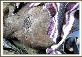 That night, the calf, who had been named Murka (after the nearby Murka Mines) collapsed and fell into a life threatening coma, which enabled us to insert an intravenous Dextrose drip into an ear vein and assess the extent of her injuries and deal with them firsthand. There was not one person present who was not horror struck and astonished that a human could be so brutal to an innocent baby that did not even have tusks! Breath was escaping through the wound in her head, and the body wounds raw and extensive. It beggared belief that humans could be so cruel and brutal to a baby elephant, especially an orphan whose mother they had probably also killed. The spear was typical of those carried by Masai tribesmen, who enjoy a reputation of being more tolerant to wildlife, but obviously the sadistic owner who inflicted such horrendous injuries on an innocent baby elephant does not fall into that category!