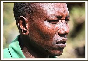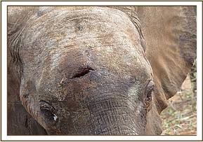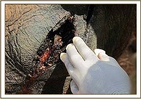 Deciding to deal with the injured Rombo calf first, the team arrived in the area at about 2 p.m. during the afternoon of 7th July, 2010 and were directed to the general location of the calf by a Ranger. The orphan was soon spotted, running from a nearby stream to hide in thick bush. A long spear, bent backwards, was protruding from its head lodged deep into the skull midway between the eyes. There were also other wounds on its body, one near the tail being very deep and fresh, exposing raw flesh and likely to have been caused by an axe.