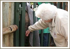 We did not expect this calf to even come round, let alone live, and contemplated removing the drip to allow her to slip away peacefully to end her agony and suffering. However, much to everyone’s astonishment, she was up by 9 a.m. the next morning but still harbouring extreme hatred of humans. However, she was sufficiently weak for the Keepers to be able to restrain her and offer her milk and water from a bottle, which she drank hungrily, desperate for more. However, the fighting spirit was still with her, and the Keepers had to make a hurried escape. Since then, she will come to inspect anything white that one might be holding in the hope that it's milk, but has to be fed through the bars of the Stockade door, still far too aggressive to risk closer contact. She has to be fed water from a bottle as well, for she appears unable to draw water up into the trunk, because of the internal damage and the gaping hole at the top which prevents the suction effect.