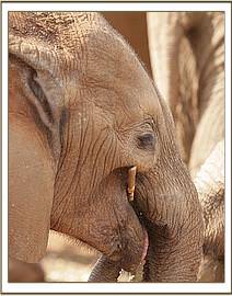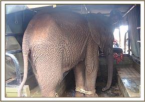The next day the same pattern continued, he relished having his head rubbed and learnt quickly to suckle the Keeper’s fingers. He did have the calming influence of his next door neighbors, Shimba and Siria, that night, but he was remarkably docile for an elephant his age so recently rescued. Thankfully it was not too long before he was gulping his milk bottle down, almost swallowing the whole plastic bottle in an effort to suck out every last drop of the delicious liquid that he had gone without for so long.