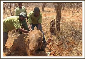 It was close to this area that the calf was finally located when the next morning our Mtito atipoaching teams continued with their search and located the calf at 12.00pm. With the leadership of their team leader Alex Macharia, the only man in the group to have captured an elephant calf before, they set about the daunting task of restraining a wild elephant of about 16 months old. They did a remarkable job, as the calf was heavy and strong, but they managed, although loading him into the back of their landrover pickup presented an even bigger challenge.