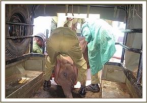 They remained with the calf in the back of their Landover, careful to make water available for him to drink as well as pouring it over him to cool him down on what was an extremely hot day, as they waited for the rescue plane at Kilaguni Airstrip. When the aircraft finally landed our Keepers went about preparing the rescued elephant for the flight, injected him with a mild tranquilizer to take the edge off the whole traumatic experience, and ensured he was given an antibiotic injection before loading him onto the Cessna Caravan.