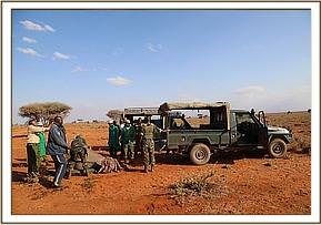 While KWS rangers and Big Life Scouts monitored the calf’s movements, SWT Keepers, four of our most experienced men, went to capture and rescue him. This required great knowledge, bravery and skill as with the Amboseli Mobile Veterinary unit away at the time on their days off, and with Dr. Poghon attending drought victims in the southern area of Tsavo East National Park, the capture was left up to our Keepers to coordinate, aided by both KWS and Big Life Scouts and Rangers. This proved to be extremely challenging, as this calf was big, and despite being extremely thin, he still remained with some strength. Mischak latched onto his tail first and from that point, despite being hauled a good long way, the rest of the team were able to circle in and throw a blanket over his head, rope him and restrain him until he lay on his side. He was immediately injected with a tranquilizer to reduce his stress levels while the team went about the second monumental challenge of trying to fit him in a land cruiser with not enough men to lift such a dead weight. With great encouragement from our team who refused to be defeated, and stoic determination from all the men desperate to help this young bull, they managed.
