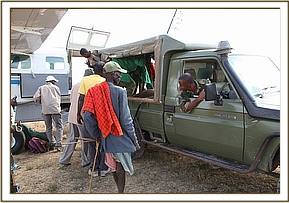 Whilst the KWS ground team was on its way to the calf’s location, the baby was seen wandering past a local manyatta (homestead). Luckily the owner was welcoming to this small orphaned elephant and immediately reported its presence to the Kenya Wildlife Service personnel based at Narok, who were already on their way and who had already contacted the Trust’s Mara Mobile Veterinary Unit.