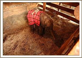 The rescue team were astonished at the size of the tiny newborn calf as he slowly emerged from the hut following those who had cared for him so nobly. He was led to the helicopter and then prepared and secured for the flight and the tiny blanketed bundle loaded onto the back seat.