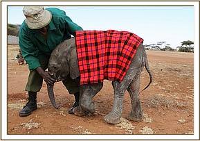 KWS officers and rangers were briefed by the SWT as to how to handle the calf and were urged to refrain from feeding him any milk, as the wrong milk is more harmful than helpful in these situations. The calf remained with company all night safely wrapped with a blanket and given water and rehydration salts.