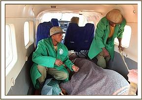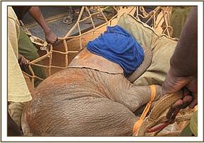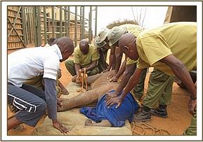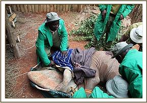 They immediately reported this to the KWS authorities who confirmed that he should be captured and held safely overnight so that the rescue team could move in in daylight hours. Our Voi Elephant Keepers travelled there the following day, 29th July, and he was driven to the Voi stockades to await the arrival of the rescue plane to airlift him to the Nairobi Nursery.