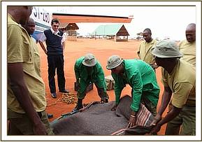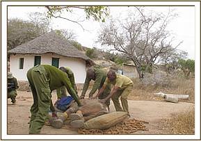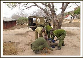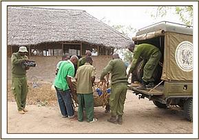 The lone calf, desperate for water, was first sighted by the scouts of both Taita and Rukinga Ranches. They remained with the elephant, observing its pitiful plight as it wandered aimlessly exhausted, emaciated and thirsty, desperately trying to reach water at a water point called Tangi overwhelmed with hundreds of Somali Cattle. The remains of two recently poached female elephants were confirmed in the area, and given the condition of the calf who had clearly been without his mother for sometime, the scouts concluded as nighttime approached that they should capture him before he befell the same destiny as his mother.
