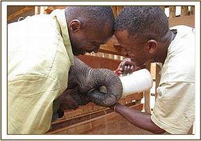 Weak and in a pitiful state this little bull was so relieved to find himself near other elephants and humans that were kind and loving, with access to milk and water, that he was calmed very quickly and relished his good fortune. He has been named Nyika (The term commonly used for the arid scrubland comiphera bush that is indigenous to the area of his rescue, which was formally known as the Taru desert). His stools were pure mud to begin with, indicating the harsh conditions to which he was tragically subjected following the loss of his mother and her life sustaining milk.