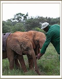 Anticipating a possible collapse during the night, we had all the life support aids at hand. This is usual in orphans of this age, who have undergone the stress of losing their elephant mother as well as that of being captured. The other Nursery elephants were brought back early to be fed their 6 p.m. milk feed within sight of the newcomer, so that he would know he was not alone, and gain confidence by seeing the established babies interacting with the Keepers, and taking their milk from a bottle. This had the desired affect, and amazingly, by morning the newcomer, who had been named Ololoo was taking milk from a hand-held bottle, and even sucking on the fingers of the attendant Keeper.