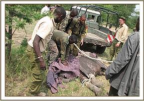 It was then that they contacted the necessary authorities who in turn contacted the Nairobi Elephant Nursery in Nairobi, who arranged for an aircraft to be on standby the next morning, should the calf be able to be captured. It was a young bull, with tusks visible, aged between 2 and 3 years of age, and therefore still dependent on milk for survival.