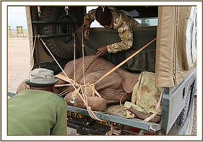 He was well under a year old, and had actually been sighted by community members for three days prior to being retrieved, so was in a very emaciated state. Given his weakness he was easily overpowered and captured, and lifted into the back of a Land cruiser to be driven to the Amboseli National park airstrip, a journey which took approximately 1½ hours, where the SWT rescue team from Nairobi were by now already in situ.