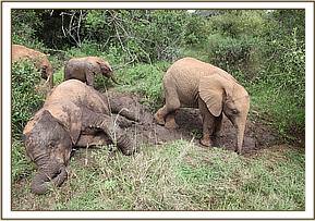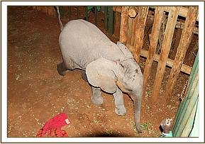 Qumquat’s baby, Quanza, was still standing beside her dead mother when this horrific poaching incident was investigated. She was located and captured during the afternoon of the 30th October 2012 and flown back to the Nairobi Nursery that evening, arriving after dark, still in good health, but understandably very traumatized and “wild”, understanding full well who murdered her elephant mother and other family members. She probably even witnessed her mother’s face hacked in half and her beautiful long thin tusks being carried off by the thugs who shot her loved ones.