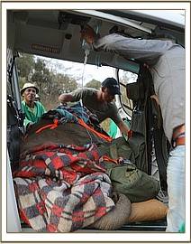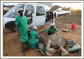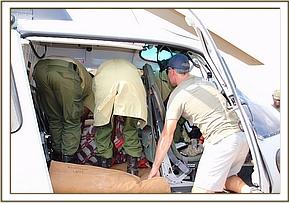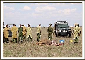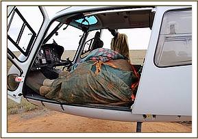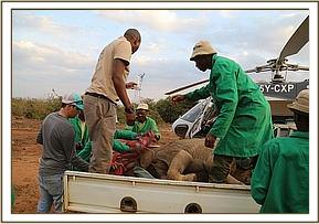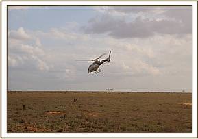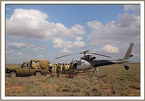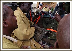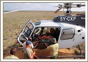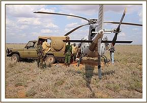 Trevor immediately reported her situation to the Kenya Wildlife Service Park Management and mobilized more men to head to the scene to help with a rescue, and in the meantime while he waited for help to come he monitored proceedings closely. Thankfully due to the intense heat, despite being aware of her, the lions remained recumbent in the shade. Given that there were no elephants in the area, and that elephants were dying from drought in large numbers by this time, there was little doubt that she was an orphan, and that her mother was likely to be one of the casualties of this brutal dry season. With time running out, and with the risk of lions killing her before a rescue could be mounted, Trevor contacted the SWT field headquarters at Kaluku to mobilize the Trust's helicopter to fly directly to the scene.