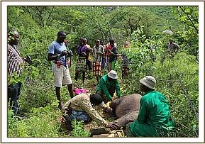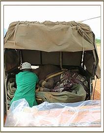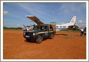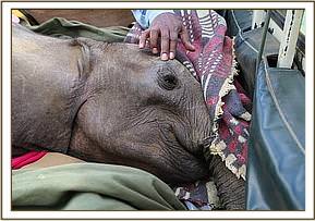 She put up little resistance when our Keepers swooped in to restrain her, after which she was laid on the usual canvas stretcher that our team had brought and with her legs strapped she was now ready for transportation to the waiting plane. This is when things became complicated because there was strong resistance to her being removed from site. It was a full two hours before a landcuiser vehicle big enough to transport the calf to the airstrip was made available for our team during which time numerous phone calls took place while negotiations to drive her to the airstrip were deliberated. Our team was all the while concerned by the time this was taking with the calf tied down and recumbent out in the bush where she had been rescued. Thankfully, it was eventually agreed that our team and the elephant be allowed to be driven in the back of the Namunyak Conservancy landcruiser to the airstrip. The Rescue Aircraft took off for Nairobi at 4.30pm.