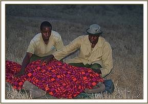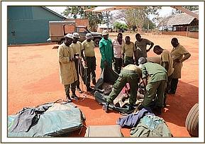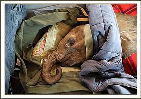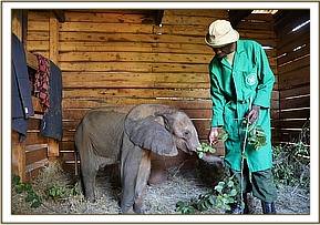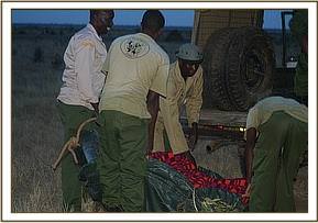 The Rescue Team left the Landcruiser to pursue him in order to restrain him, which proved a simple task due to his lack of reserves, and because he still so young, estimated to be approximately only 3 to 4 months old. Once he was restrained, the Rescue Team lay the baby down, on the Capture Mattress and Canvas Stretcher before driving him to the Voi stockades, where he was kept overnight in a stable with a Keeper by his side. He fed on milk and rehydration salts and despite being restless throughout the night, he did manage to sleep on the soft hay for short periods of time.