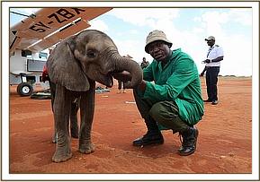 The following day a team of Keepers from our Nairobi Nursery flew the one and half hour journey to our Voi headquarters of Tsavo East National Park, arriving in the morning in order to collect the baby so that he could be afforded the intensive care he required. He was driven to the Voi airstrip by the Voi Keepers where the two teams swapped their precious cargo, where he was given the opportunity to stretch his legs walking around the airstrip, all the while trustingly following the Keepers and later guzzling down another milk feed before the flight. Once he was safely loaded onto the plane, the Team placed him on IV fluids throughout the flight to help with his compromised condition.